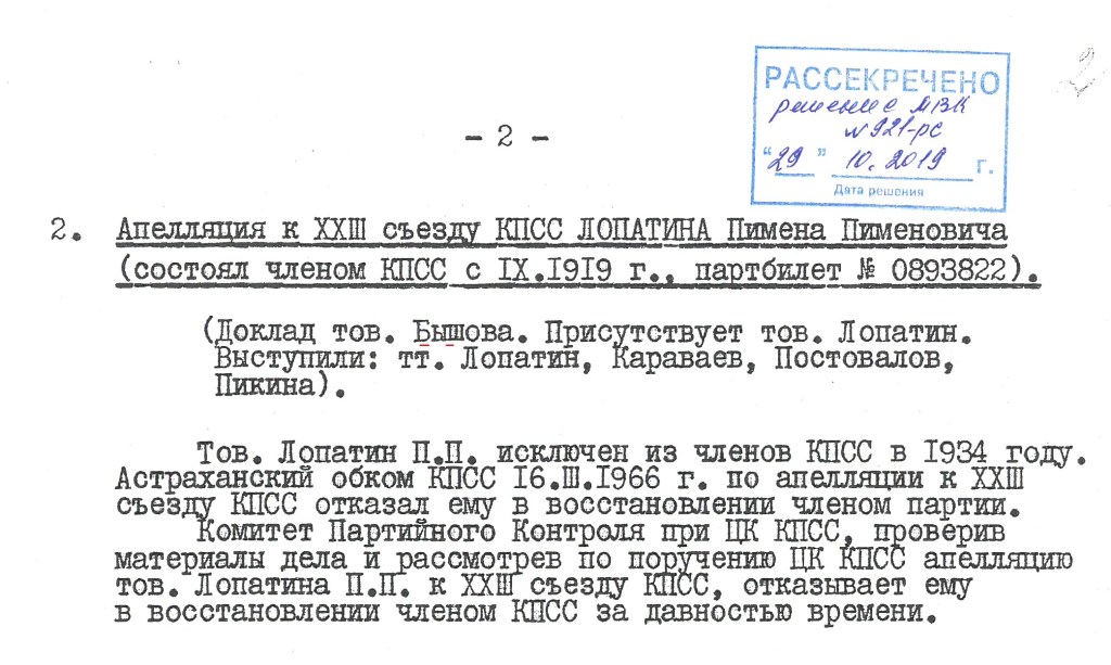 В 1966 Лопатин написал новую апелляцию к XXIII съезду, что породило новый виток разбирательств и травли. Для разбора дела из Москвы в Астрахань специально выезжал секретарь Комитета партийного контроля при ЦК КПСС И.В. Бышов. Оба раза дело спущено вниз на уровень первички и Астраханского обкома, где получил хорошо срежиссированный отказ.