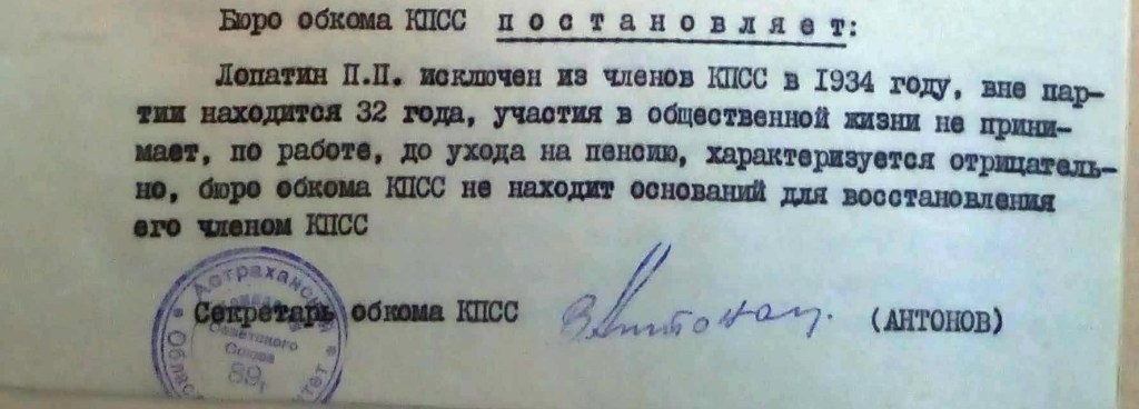 «…Вот заведующий конструкторским бюро Лопатин П.П. – это тот самый Лопатин, который еще в 1933 г., будучи главным инженером на заводе им. Энгельса, срывал работу, вел антисоветскую агитацию, был разоблачен и исключен из партии.