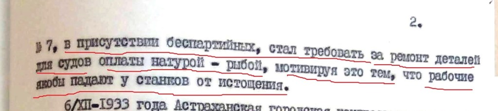 Из персонального дела № 52: «Во время переговоров с директором шаланды № 7 о ремонте деталей, в присутствии беспартийных, стал требовать, чтобы за работу платили не деньгами, а рыбой, мотивируя это тем, что рабочие падают у станков от истощения. Если не верите, сходите и посмотрите на всех».