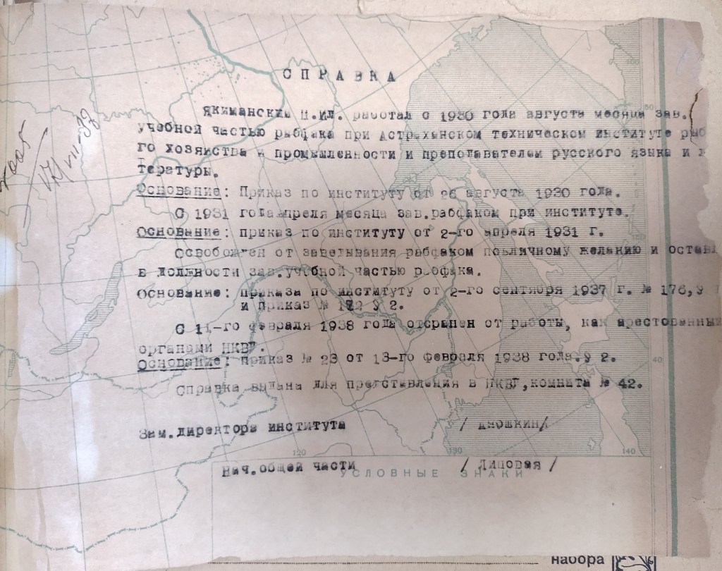 Осенью 1922 года, вследствие тяжелого материального положения /невыплата жалования в течении 8 м-цев/ необходимости дать образования детям, я переехал в г. Астрахань. Работал в должности инспектора ГубОНО, завед. Школьным Отделением ГубОНО, в должности заведующего учебной частью школы II ступени имени В.И. Ленина. В течение 1922-23 года работал в Совпартшколе Калмыцкой Овтообласти в качестве группвода /вечерние занятия/ по совместительству. Вся работа в учреждениях ОНО сопровождалась работой среди широких рабочих и крестьянских масс населения, также и войсковых частей в виде чтения: лекций, рефератов, докладов, проведение кампаний и т.д.